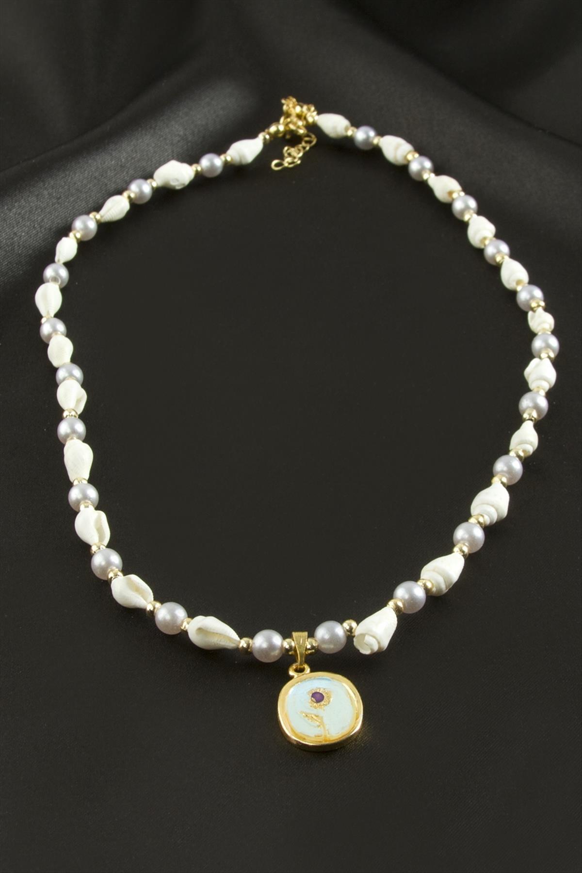 Kolye; Ürün malzemesi metal ve inci boncuktur. Ürün boyu 45 cmdir.