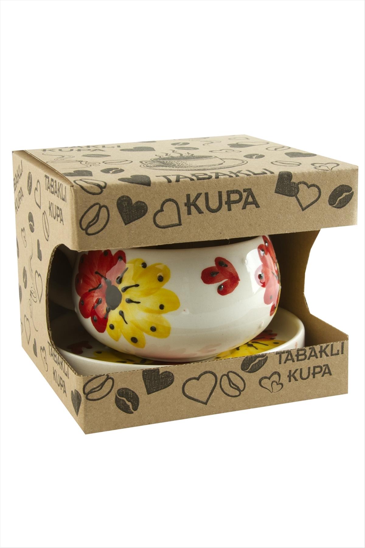 Tabaklı Kupa; Ürün malzemesi seramiktir. Üzerindeki desenler elle çizilip fırınlanmıştır. İçecekleri uzun süre sıcak tutar ve darbelere karşı dayanıklıdır. Ürün kutu içinde tabak ve kupasıyla beraber gönderilecektir. Ürün boyu kupa çapı 8,5 cm ve tabak boyu 12 cmdir.