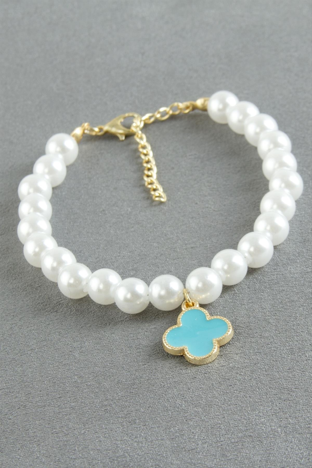 Bileklik; Ürün malzemesi inci, mine boyama ve metaldir. Kartlıdır. Boyu 19 cmdir.