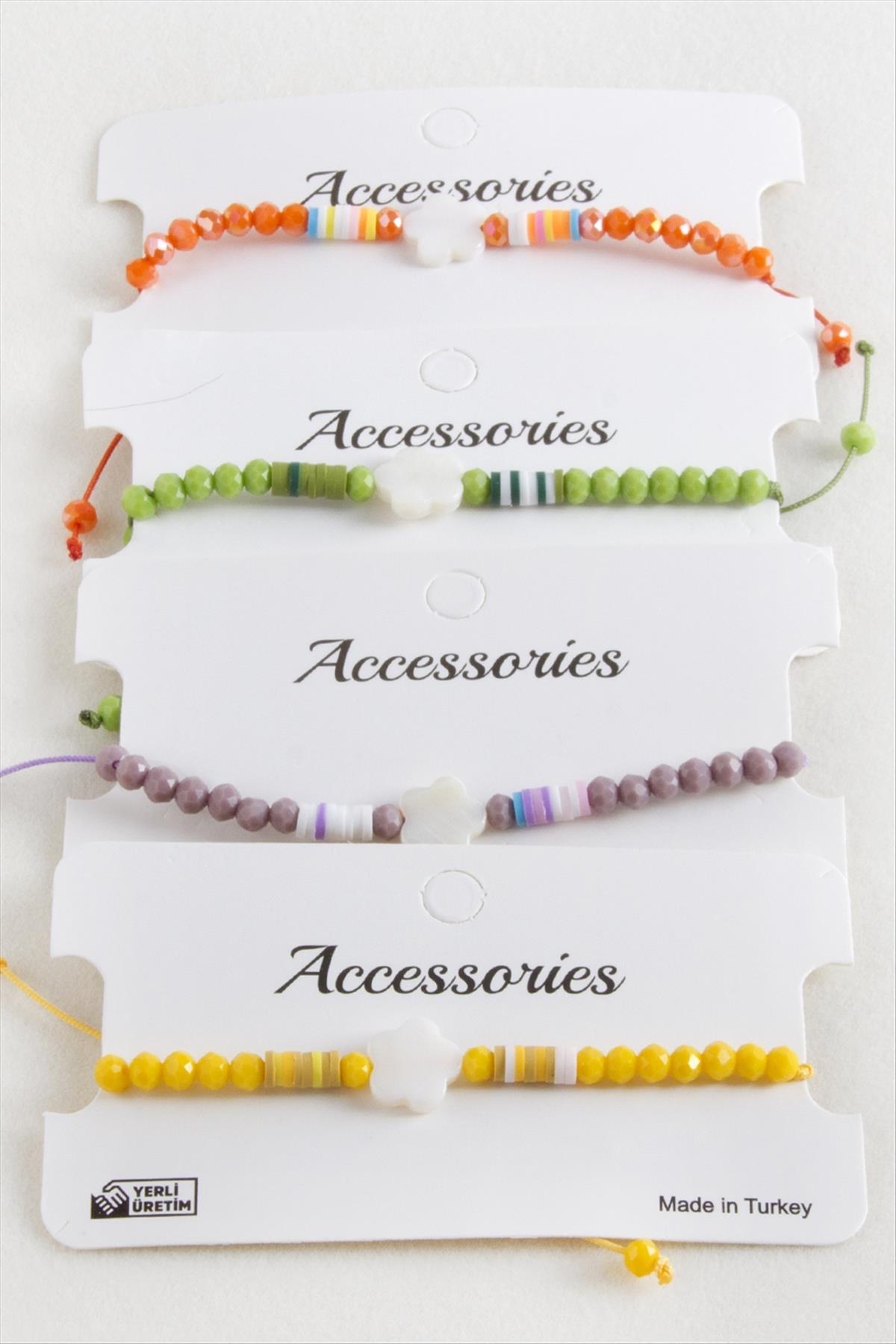 Bileklik; Ürün malzemesi sedef, kristal ve makrome iptir. Ürün arkası asansörlüdür. Bileğe göre ayarlanabilir. Aparat boyu 1 cmdir.