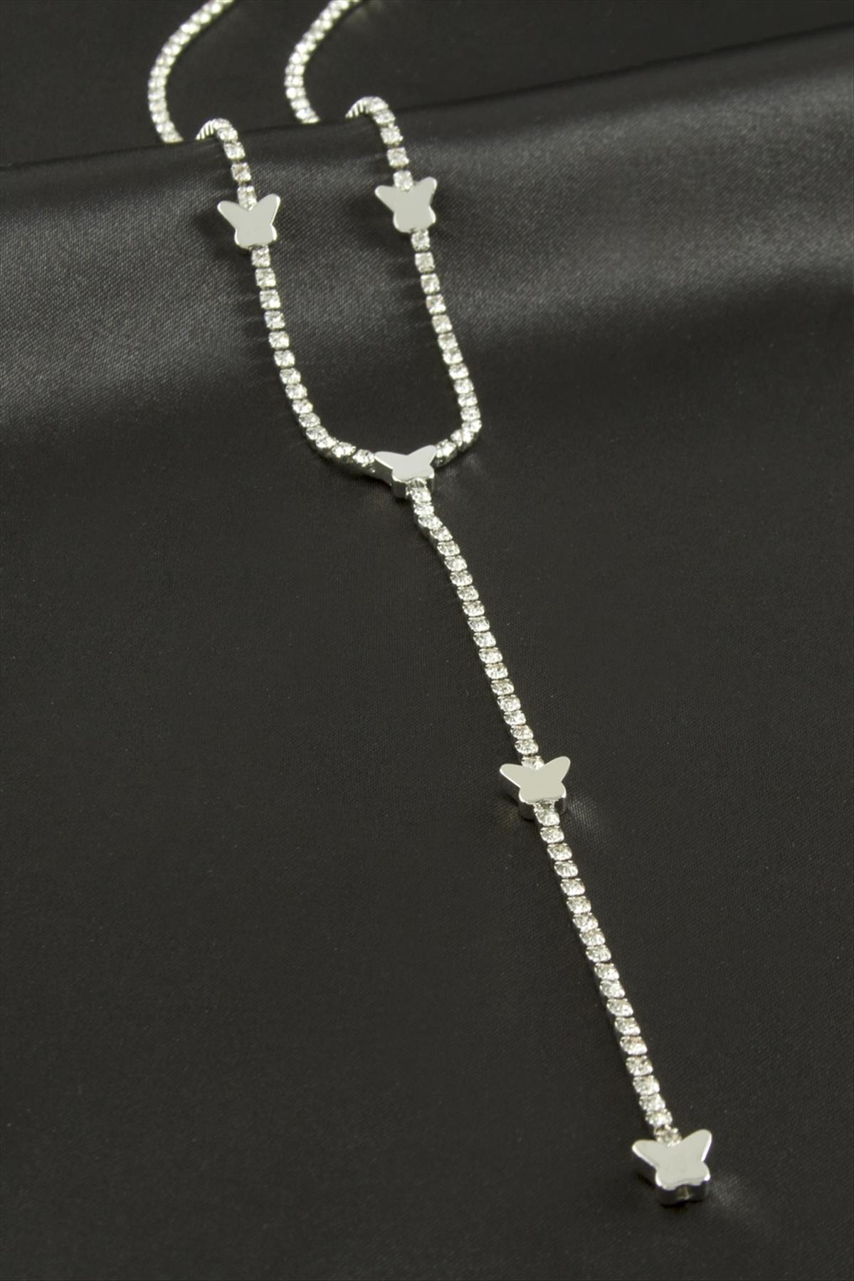 Kolye; Ürün malzemesi taş ve çeliktir. Ürün boyu 45 cmdir. Ucundaki sallantılı zincir bölümü uzunluğu 13 cmdir. Taş boyu 2 mmdir.