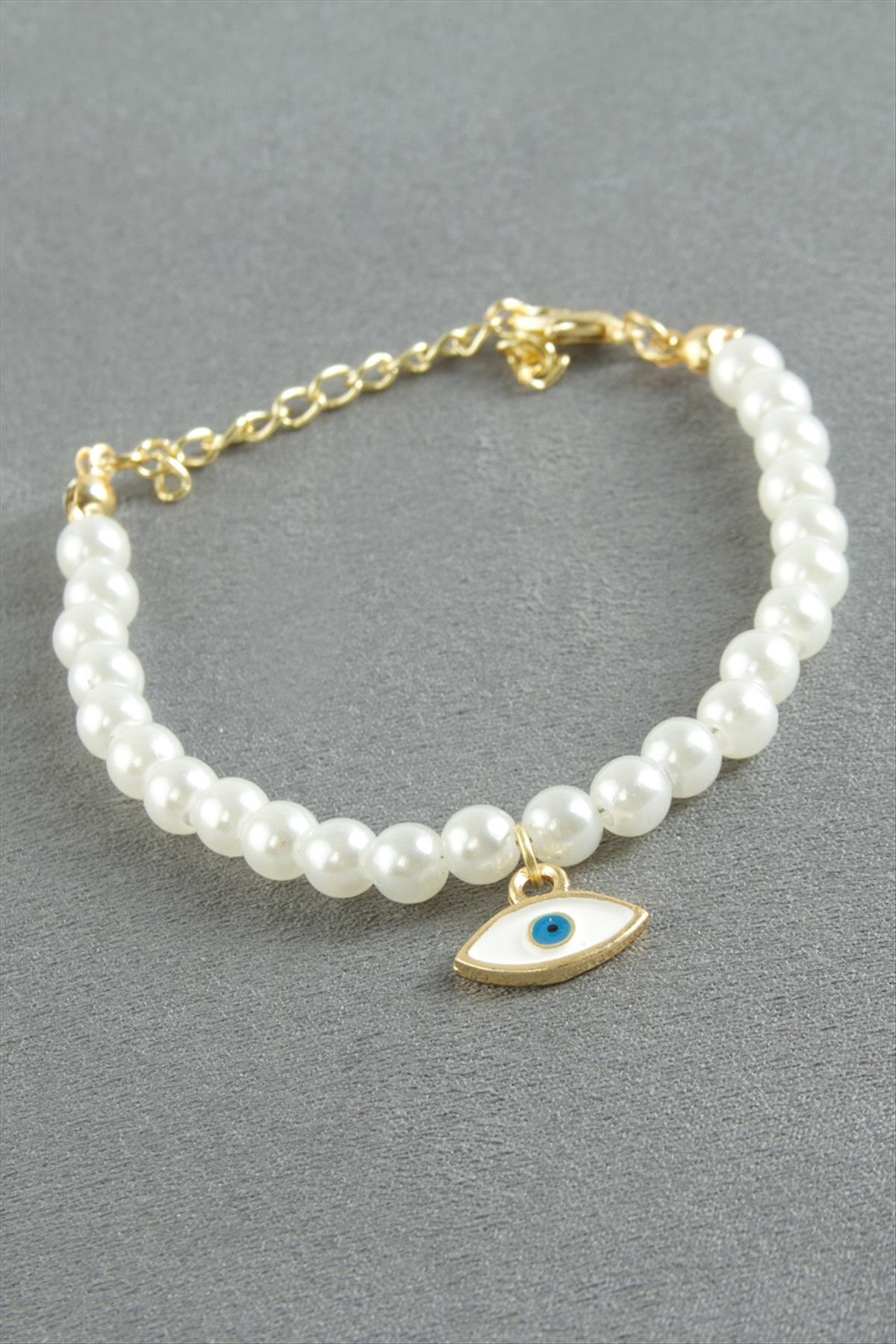 Bileklik; Ürün malzemesi inci, mine boyama ve metaldir. Kartlıdır. Boyu 19 cmdir.