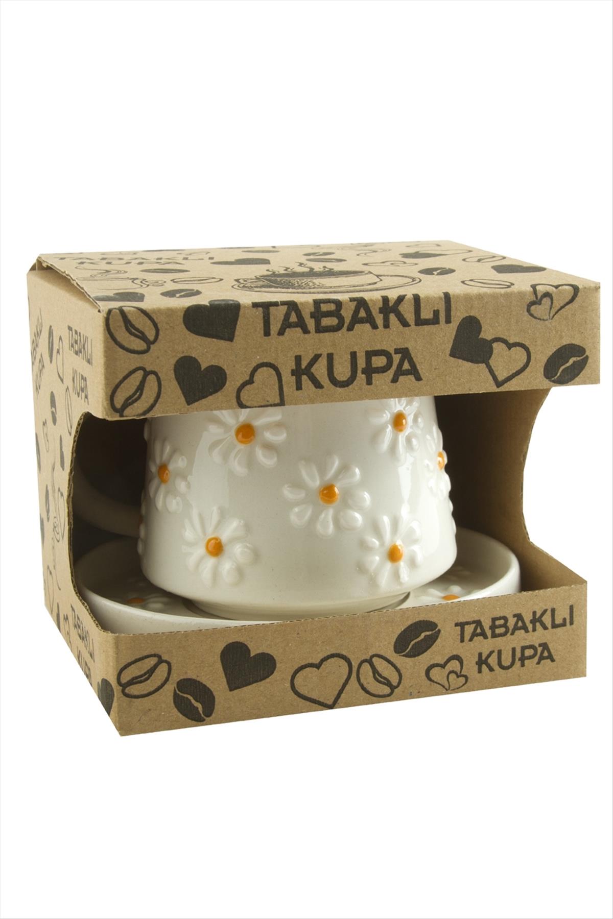Tabaklı Kupa; Ürün malzemesi seramiktir. Üzerindeki desenler elle çizilip fırınlanmıştır. İçecekleri uzun sür sıcak tutar ve darbelere karşı dayanıklıdır. Ürün kutu içinde tabak ve kupasıyla beraber gönderilecektir. Ürün boyu kupa çapı 8,5 cm ve tabak boyu 12 cmdir.